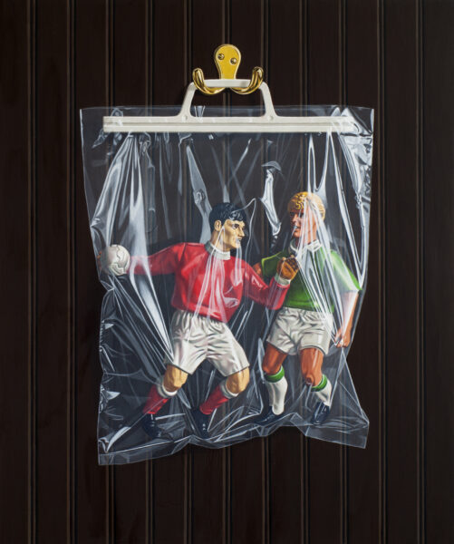 In our twelfth Artist Series edition we’ve collaborated with realist painter Simon Monk on a front and back t-shirt featuring two paintings. “The piece with footballers in a bag is from a time when I was interested in the idea…